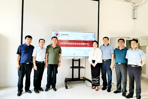 5月30日下午,亚洲成人 在科技楼A座举行潍坊市民营牙医协会助学捐款仪式,亚洲成人 党总支书记高祥春、院长胡温庭以及学生代表出席捐款仪式。