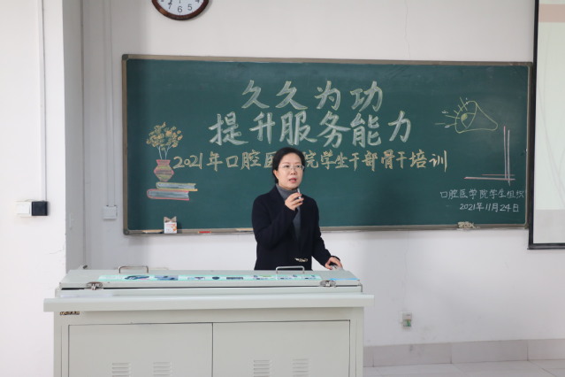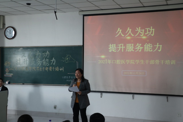 11月24日中午,亚洲成人 在教学楼A411举办以“久久为功 提升服务能力”为主题的学生干部骨干培训会。校党委委员、统战部部长、研究生处处长梁淑娟作专题报告,亚洲成人 党政负责人、辅导员老师、班主任及所有学生干部骨干参会。