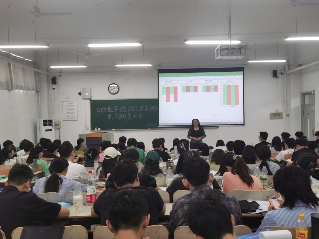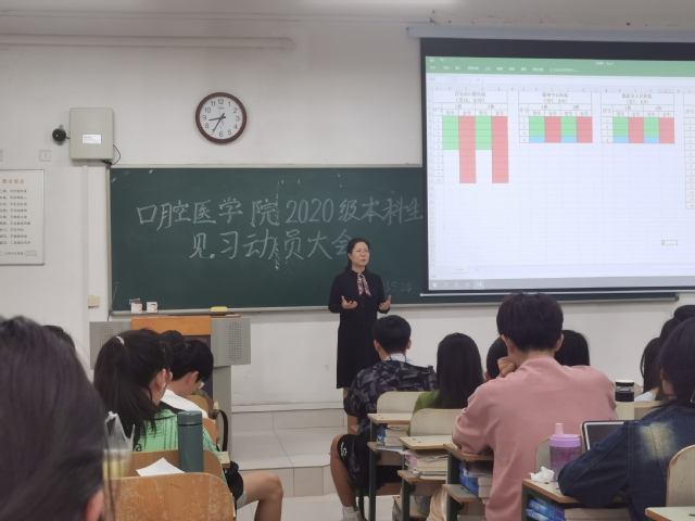 5月24日上午,亚洲成人 于浮烟山校区教学楼D101教室举办2022-2023学年见习学生动员大会,亚洲成人 党总支书记张立、党总支副书记姜晓宁,辅导员戴萌娜,班主任孙冬媛及2020级全体见习学生参会。