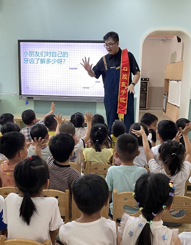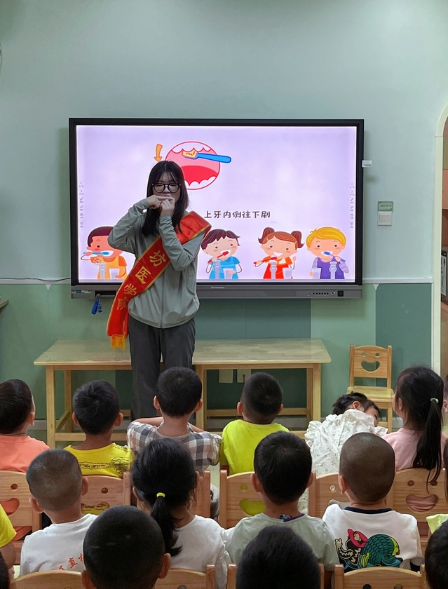 “久久为功,志愿先行,志在心中,愿在行动!我们这次志愿服务活动,目的在于发挥专业之长,将爱牙护齿知识带进学校。帮助小朋友们从小养成良好的口腔健康习惯,致力于提高全民健康意识。”微笑服务队的队长是口腔医学专业2021级的梁寒雪同学,她放假的第一时间并没有回湖南株洲老家,而是选择了留下参加此次社会实践活动,她笑着说:“面对这么可爱的孩子们,我一点也不紧张,就像我在家带我的小弟弟一样啊。”