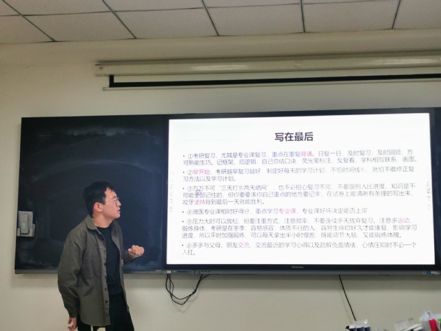 会上,王晓勇首先结合自身的考研规划,为同学们罗列出了每个时间段详细的备考计划,并对政治、英语、专业课上可能存在的难点、困惑和学习方法进行了的解答和推荐。其次,史翊辰着重从生活方面向同学们提出了“三保障”的备考建议,即饮食保障、睡眠保障、防寒保障。最后,张晓蕾向同学们强调了考研中心态的重要性。考研不是终点,只是人生中的一部分,我们要有当仁不让的信心和全力以赴的决心,亦要有无惧失败的恒心。