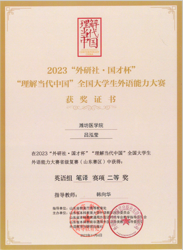 11月4日-5日,在由山东省教育厅高等教育处指导、山东省本科教育大学外语教学指导委员会等主办的2023年“外研社•国才杯”“理解当代中国”全国大学生外语能力大赛山东赛区决赛中,亚洲成人 吕泓莹同学代表学校参与笔译专项赛事,获得二等奖。