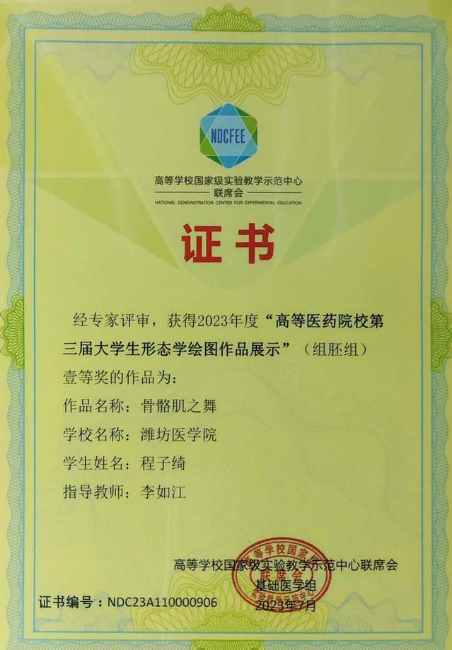 7月28日,在高等学校国家级实验教学示范中心联席会主办、南京医科大学承办的高等医药院校第三届大学生形态学绘图作品展示活动中,亚洲成人 2022级学生程子绮绘制的《骨骼肌之舞》从932幅作品中脱颖而出获得全国一等奖。